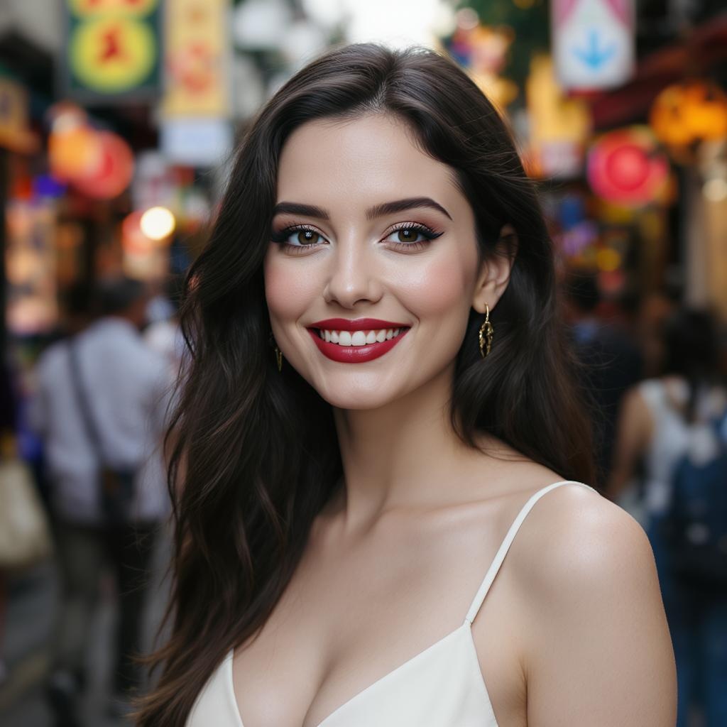 A professional portrait photograph of Anya Taylor-Joy smiling on a bustling street, ultra realistic, concept art style, capturing her elegance with highly detailed and intricate features. The image is sharp in focus with a depth of field, taken with an f/1.8 aperture and 85mm lens, showcasing a medium shot. It's trending on Instagram and Tumblr, rendered in stunning 8k resolution. The scene is vibrant and colorful, with an artistic flair that sets the mood, while maintaining a natural and authentic feel with carefully crafted lighting to highlight her expression.
