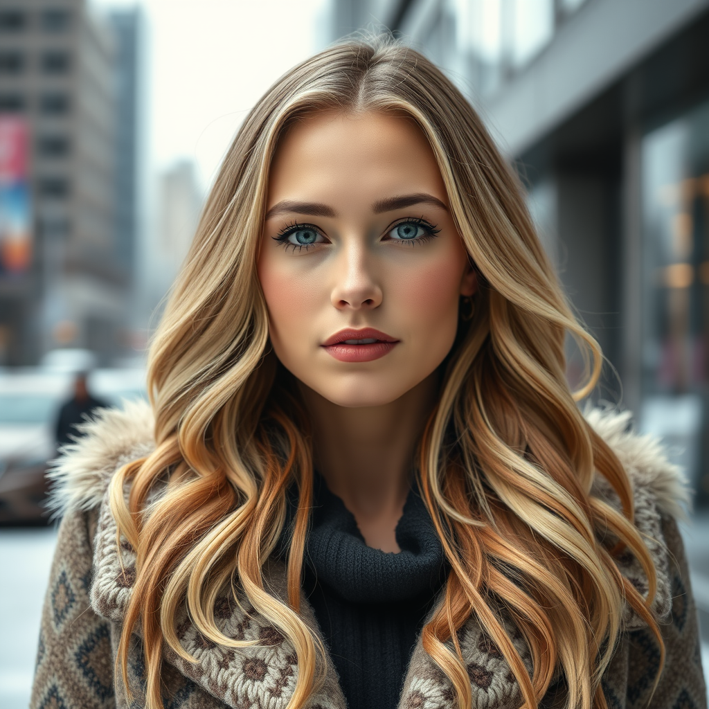 A professional portrait photograph of Gal Gadot in stylish winter attire, featuring long wavy blonde hair and subtle freckles. Her symmetrically beautiful face is accentuated with cute, natural makeup. Set against a stunning, modern urban environment, the scene is ultra-realistic and elegantly detailed. The composition offers sharp focus and depth of field at f/1.8 using an 85mm lens, capturing a medium, mid shot. A hint of volumetric fog adds atmosphere, contributing to the image's popularity on platforms like Instagram and Tumblr. The picture is rendered in high dynamic range with both 4K and 8K clarity, maintaining a realistic and cinematic quality.