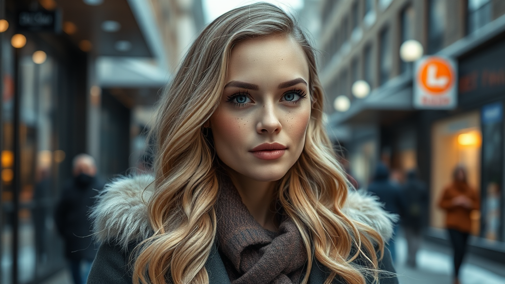 A professional portrait photograph of Gal Gadot wearing stylish winter clothing, her long wavy hair transformed into a soft blonde hue. Her skin has a delicate sprinkling of freckles, enhancing her symmetrical and beautiful face, complemented by cute and natural makeup. The setting is a stunning, modern, upscale urban environment, captured with a focus on ultra-realistic detail and concept art elements. The image is elegantly composed and highly detailed, with intricate features captured in sharp focus and a depth of field set at f/1.8 using an 85mm lens. It's a medium shot, enveloped in a light, volumetric fog, delivering a cinematic feel trending on Instagram and Tumblr. The photograph boasts HDR quality at 4k and 8k resolution, emphasizing its realistic and breathtaking presentation.