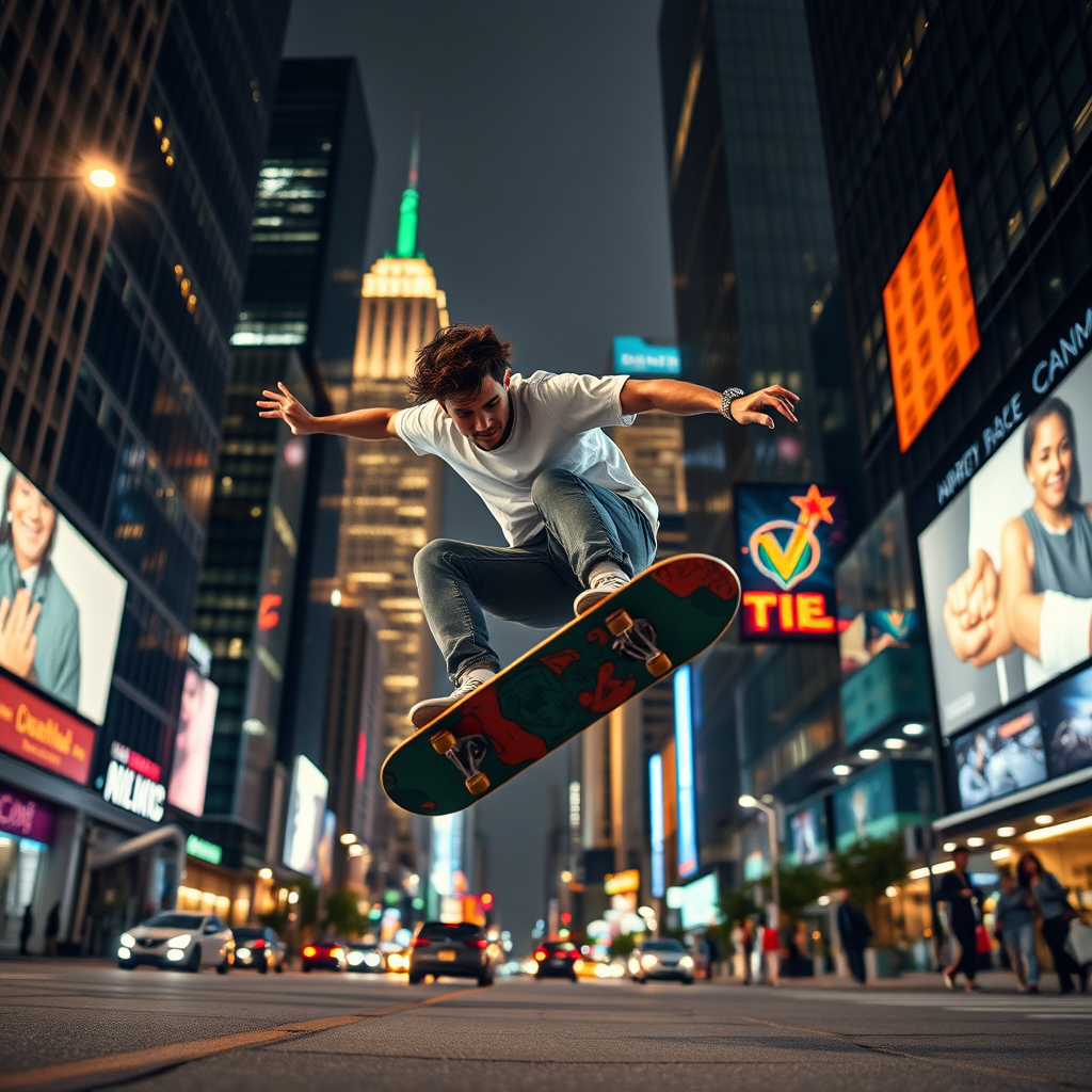 A professional skateboarder performing an ollie in the bustling cityscape, captured in a high dynamic range photograph that juxtaposes the vibrant energy of the urban environment with the fluid, artful motion of the skater, as skyscrapers and city lights paint a captivating backdrop.