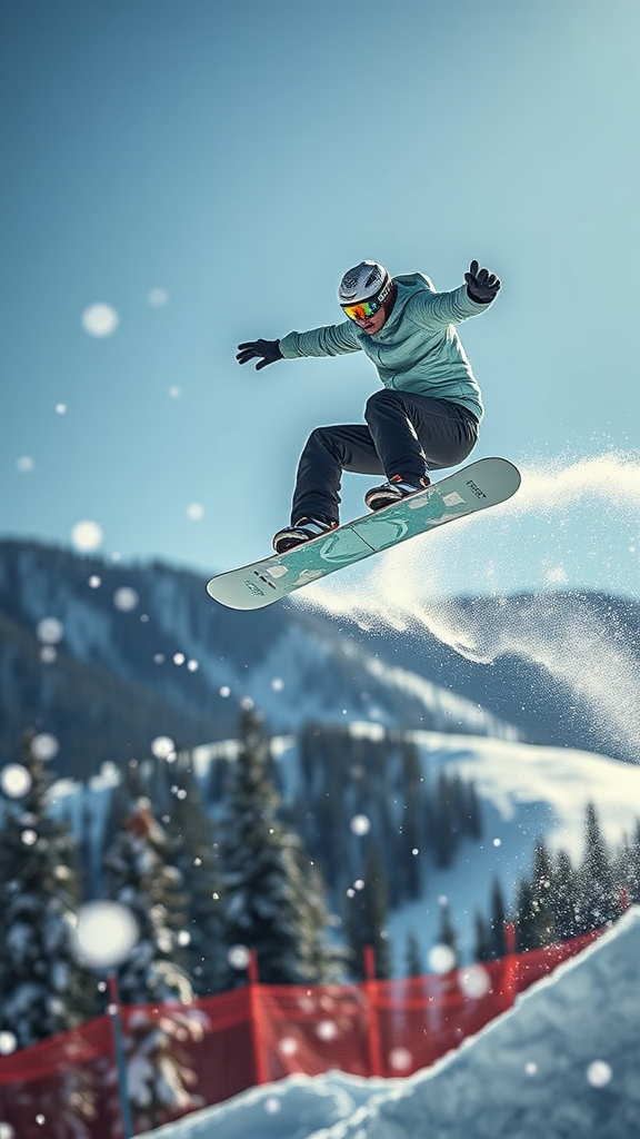 A professional snowboarder soaring through the air in the snowboard park captures the essence of action sports photography. Equipped with a Canon EOS-1D X Mark III and Canon EF 70-200mm f/2.8L IS III USM lens, the scene showcases stunning dynamic range and depth of field. The image is imbued with realism and illuminated by bright sunlight, highlighting fluttering snowflakes against a dramatic landscape backdrop. Rich, clear details bring the moment to life, embodying the thrill and artistry of the sport. The composition, in a 9:16 aspect ratio, exudes a raw and personalized aesthetic, with a style that deeply resonates with individualized flair.