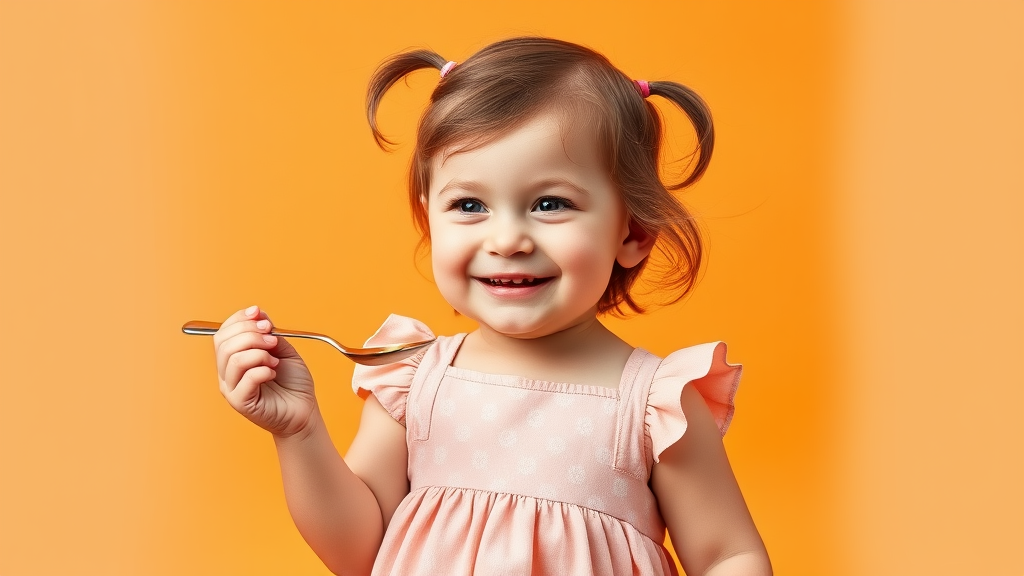 A professional studio photograph of an adorable 3-year-old British girl in a pastel-colored dress, playfully holding a spoon against a bright orange background, her eyes sparkling with curiosity and a delightful giggle on her face.