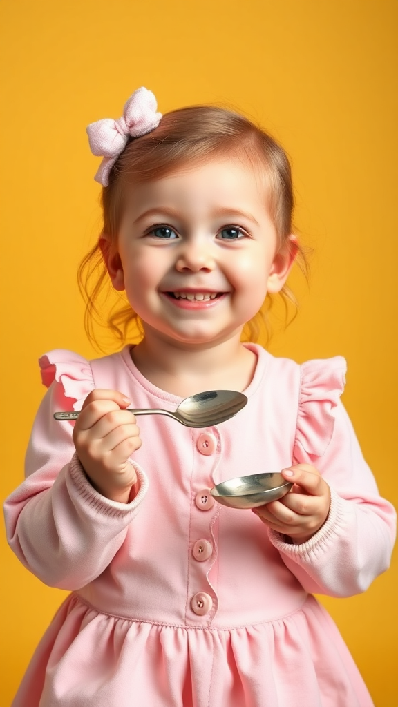 A professional studio photograph of an adorable 3-year-old British girl dressed in a soft pastel ensemble, playfully holding a spoon against a sunny yellow backdrop, her eyes wide with delight and a charming little grin highlighting her amused expression.