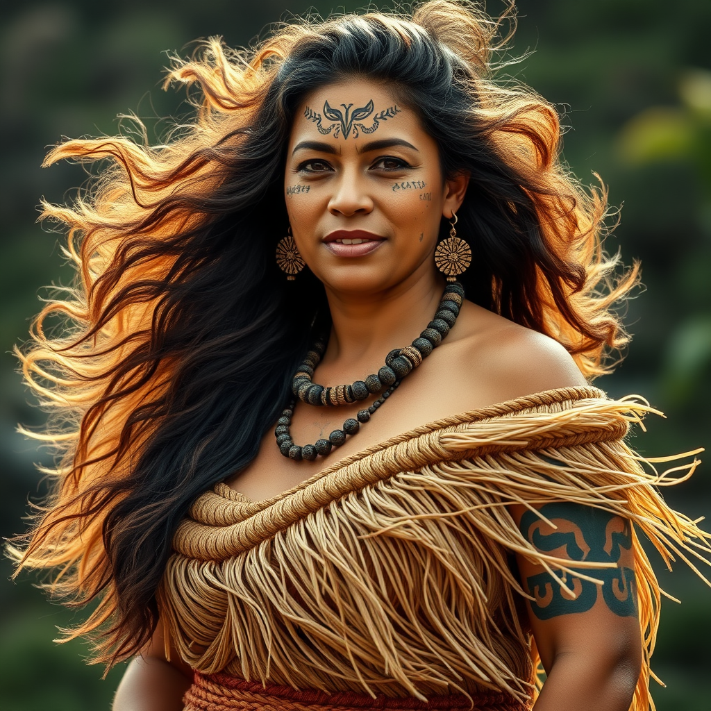 A proud woman of Maori heritage stands with grace, her face beautifully marked with sacred moko tattoos that narrate the rich history and culture of her ancestors. Her hair cascades in a voluminous, wild mane, echoing the strength and beauty of her lineage. Draped in a traditional, intricately woven flax skirt, it rustles softly with her every movement, reflecting the harmony between her and the natural world. The scene is vibrant and alive, paying tribute to the deep connection she holds with her heritage and the land she calls home.