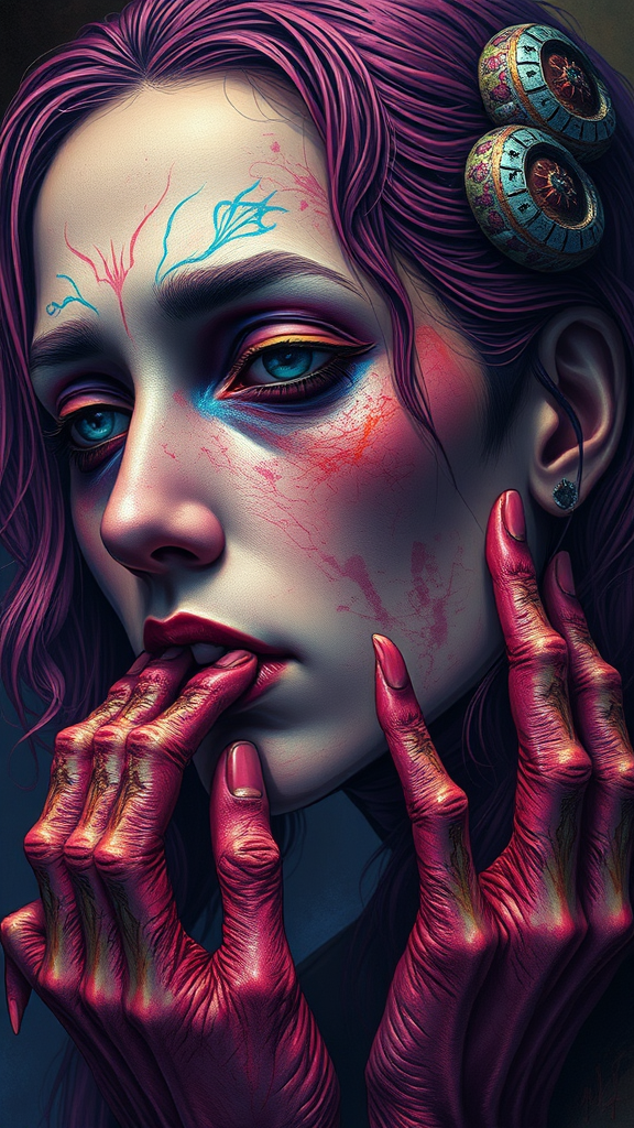 A psychedelic portrait in a vibrant color scheme, highly detailed with a romanticism influence, cinematic with touches of artstation style reminiscent of Moebius and Greg Rutkowski. The image includes text elements, intentional errors, and an appearance of being cropped. It features characteristics of low resolution, with visible jpeg artifacts that convey a sense of imperfection, along with a semblance of darkness. The artwork might seem duplicated, with morbid undertones and potential mutilations. Portions are out of frame, showcasing distortions like extra fingers and mutated hands. Faces and hands may appear poorly drawn, exhibiting mutations and deformities, with areas that are blurry or dehydrated. The anatomy may be flawed with bad proportions, suggesting extra or missing limbs, cloned or disfigured faces. Expect gross proportions, malformed limbs, fused or too many fingers, alongside exaggerated features like a long neck.
