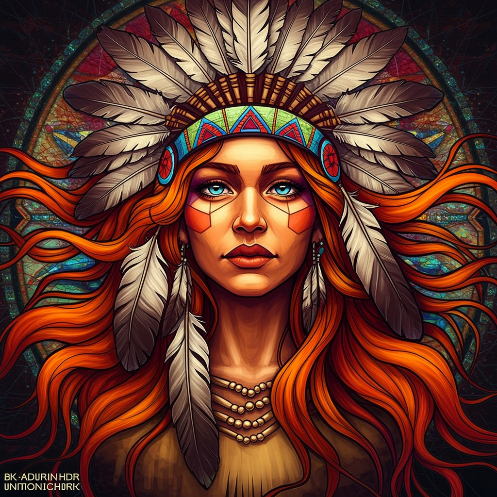 A psychedelic portrait of a Native American woman with feathers in her hair, depicted in vibrant colors with striking orange hair flowing around her. The artwork features high detail in an 8K UHD HDR format, capturing the essence of a stained glass aesthetic. Her skin radiates warmth and vibrancy, while her eyes exhibit a unique, mesmerizing quality. The piece embraces surrealism, showcasing artistic mutations with elongated elements and unconventional beauty. It maintains clarity and sharpness, avoiding common artistic pitfalls such as blur, distortion, or poor rendering. The composition is complete and centered, with no extraneous elements such as text, logos, or watermarks, ensuring a seamless visual experience that fully captures the colorful and intricate design.