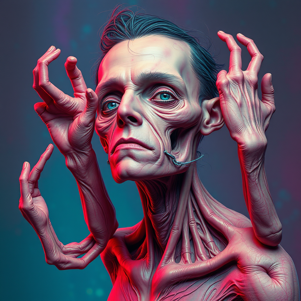 A psychedelic portrait with a vibrant color palette, capturing fine details, inspired by romanticism and cinematic styles, reminiscent of ArtStation and the work of Moebius and Greg Rutkowski. The image is characterized by textural errors, visible jpeg artifacts, and intentional low resolution aesthetics. The composition features a surreal and distorted figure with duplicated and mutated elements, including extra and fused limbs, an elongated neck, and disfigured facial features. The anatomy is purposefully flawed with a focus on disproportionate and grossly malformed proportions, resulting in an imaginative yet unsettling visual exploration.