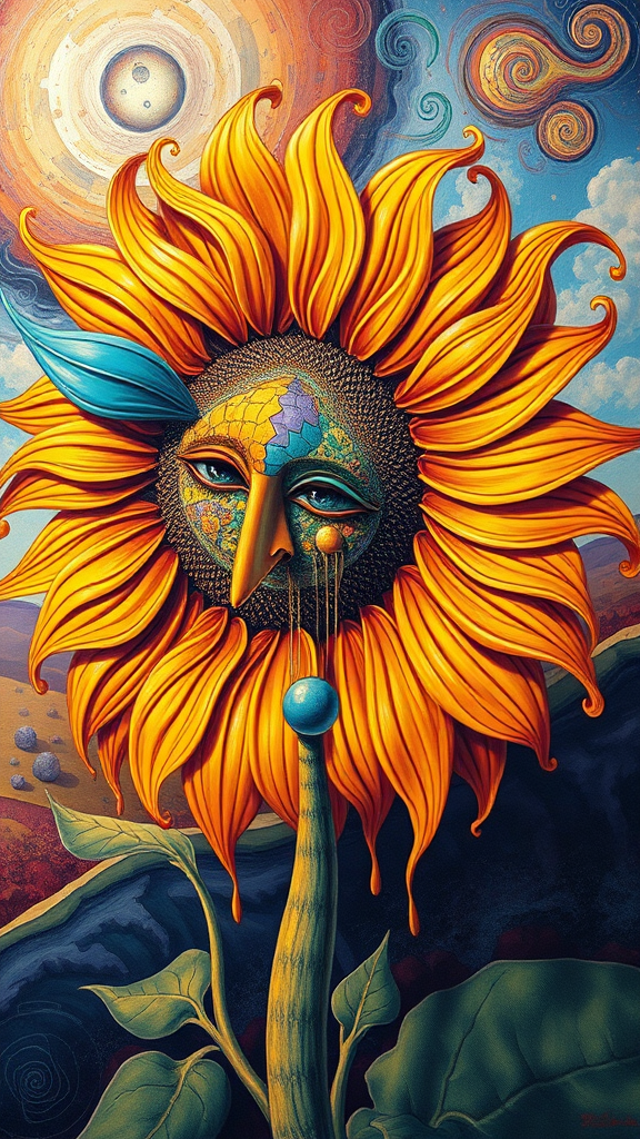 A psychedelic surrealist painting of a sunflower with vibrant, swirling colors, petals bending and twisting in dreamlike forms, dripping and melting in a whimsical dance reminiscent of Salvador Dali and Pablo Picasso, the sunflower's face a mosaic of fragmented cubist shapes, surrounded by a surreal landscape that blurs the boundary between sky and earth, elongated shadows casting abstract patterns, evoking a sense of timeless wonder and creative chaos.