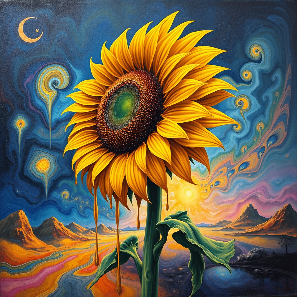 A psychedelic surrealist painting of a sunflower with vivid, swirling colors and dreamlike distortions, its petals dripping and melting into surreal, fluid shapes reminiscent of Salvador Dali's landscapes and the abstract fragmentation of Pablo Picasso. The scene blurs reality and imagination, with elongated forms and unexpected angles, conveying a sense of movement and transformation, evoking a deeply immersive and otherworldly atmosphere.