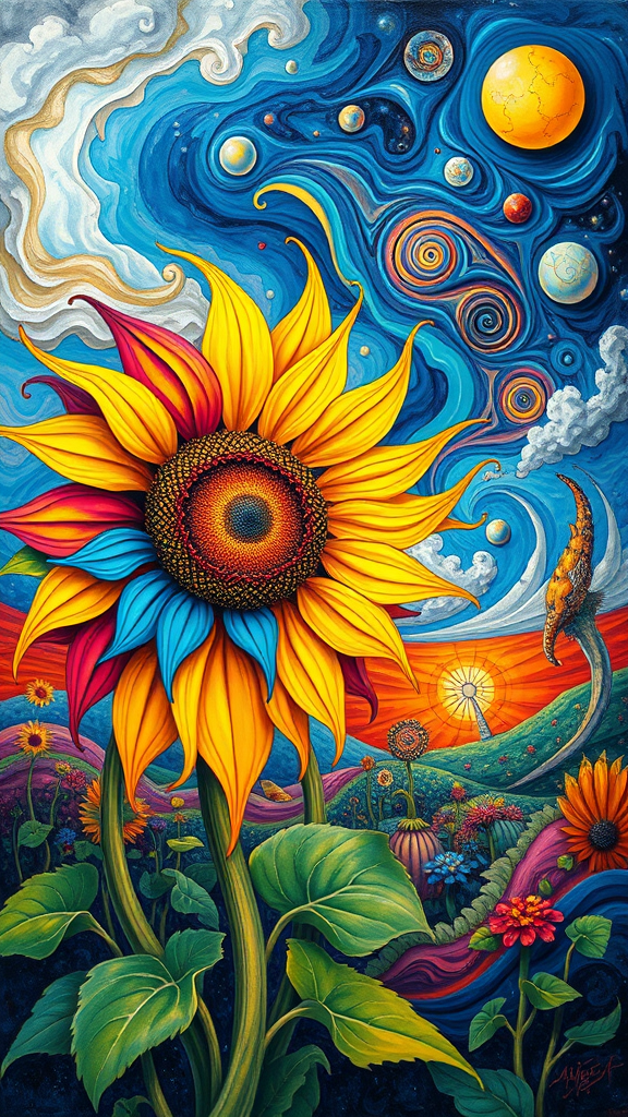 A psychedelic surrealist painting of a sunflower with vibrant, swirling colors, petals morphing into dreamlike shapes, dripping and melting in a Salvador Dali and Pablo Picasso fusion, blending abstract geometry with fluid forms, elongated stems twisting through a distorted landscape under a surreal sky, infused with a whimsical essence and hallucinatory details, capturing both movement and stillness, evoking an otherworldly garden atmosphere.