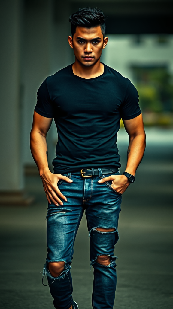 A psychotic and intense-looking fit and handsome Asian man wearing a black t-shirt, ripped blue jeans, and sneakers. He has an unusual aura, with uniquely styled, sinewy limbs and a defined muscular build. His presence is both intriguing and unsettling, with sharp, piercing eyes and a distinct fashion sense that exudes charisma. The setting is slightly blurred, enhancing the focus on his commanding stature and mysterious allure, as if he belongs to an unreal, dreamlike world.
