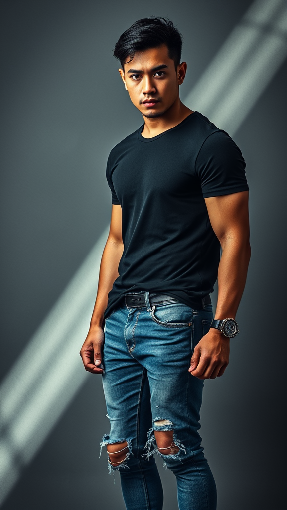 A psychotic-looking, fit, and handsome Asian man wearing a black t-shirt, ripped blue jeans, and sneakers. He has an intense gaze and a mysterious aura. His physique is strikingly muscular with a lean, athletic build. The overall appearance is edgy and dynamic, exuding confidence and intrigue. The setting adds to the sense of mystery, with abstract shadows and highlights accentuating his features. The focus is on creating an image that is both captivating and slightly surreal, blending elements of intensity and charisma seamlessly.