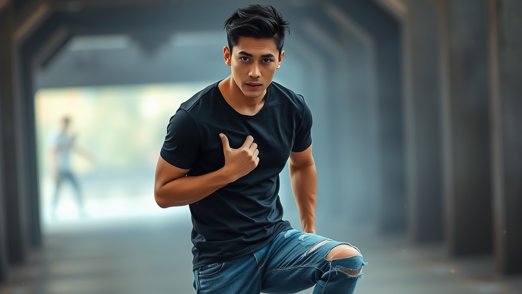 A psychotic-looking, fit, and handsome Asian man wearing a black t-shirt, ripped blue jeans, and sneakers. His appearance suggests an intriguing complexity, with hints of muscular definition and an enigmatic aura. His posture is dynamic, conveying a sense of action and intensity. The setting around him is blurred and dreamlike, adding to the surreal atmosphere. His eyes reflect a depth of emotion, revealing a story untold. Despite any distortions, his expression remains captivating, drawing the viewer into his world. In the background, faint hints of abstract shapes and colors create a sense of movement and energy, further enhancing the mystery and allure of his presence.