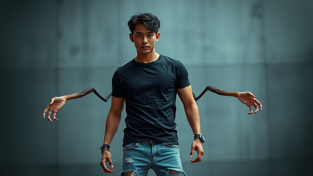 A psychotic yet captivating Asian man clad in a black t-shirt, ripped blue jeans, and stylish sneakers. He possesses an aura of intensity with subtly altered features like mutant limbs and unique anatomy. His muscular build is evident, showcasing strength and a powerful presence. The scene captures an abstract essence with elements of surrealism, such as unusual body proportions and intriguing facial expressions. The background is blurred, creating a dreamlike quality, while extra limbs and artistic distortions add to the fantastical atmosphere. It's a study of contrasts—blending beauty and the bizarre, the alluring and the unsettling.