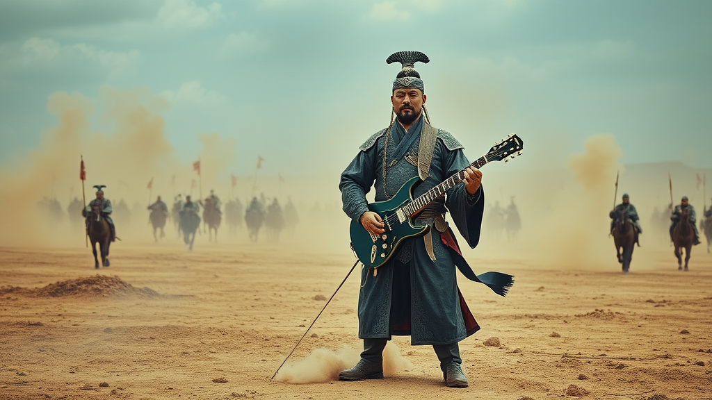 A Qin Dynasty general stands resolute on a vast, dust-covered battlefield, holding an electric guitar with an air of defiance. Smoke swirls around him, and the distant thundering of hooves signals the approach of an army on horseback in the background. The scene is captured in a panoramic, hyper-realistic style, highlighting the surreal blend of ancient and modern elements in this striking portrait.