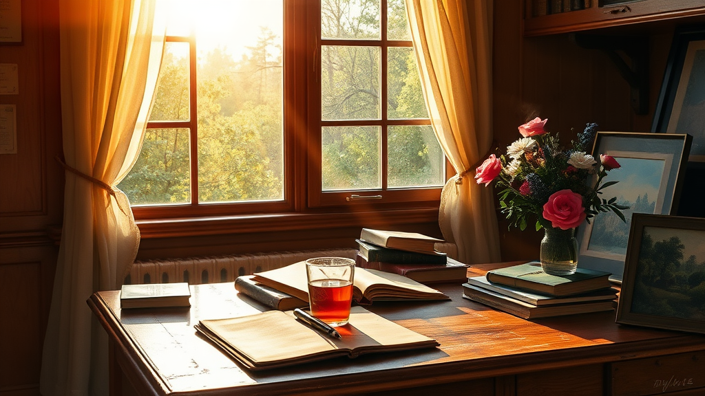 A quaint 1800s study room bathed in the warm glow of the golden hour, with sun rays streaming through an open window. The scene outside reveals a lush forest, its greenery swaying gently in the breeze. Tulle curtains dance softly at the window, creating a play of light and shadow across the room. Inside, a sturdy wooden table is laden with a collection of well-worn textbooks and a leather-bound notebook with a pen resting atop it. Nearby, a glass cup filled with steaming hot tea exudes a comforting aroma, its steam curling lazily upwards. A pot of vibrant flowers adds a splash of color to the room's antiquated charm. An intricately detailed watercolor painting leans against the old walls, capturing a moment frozen in time.