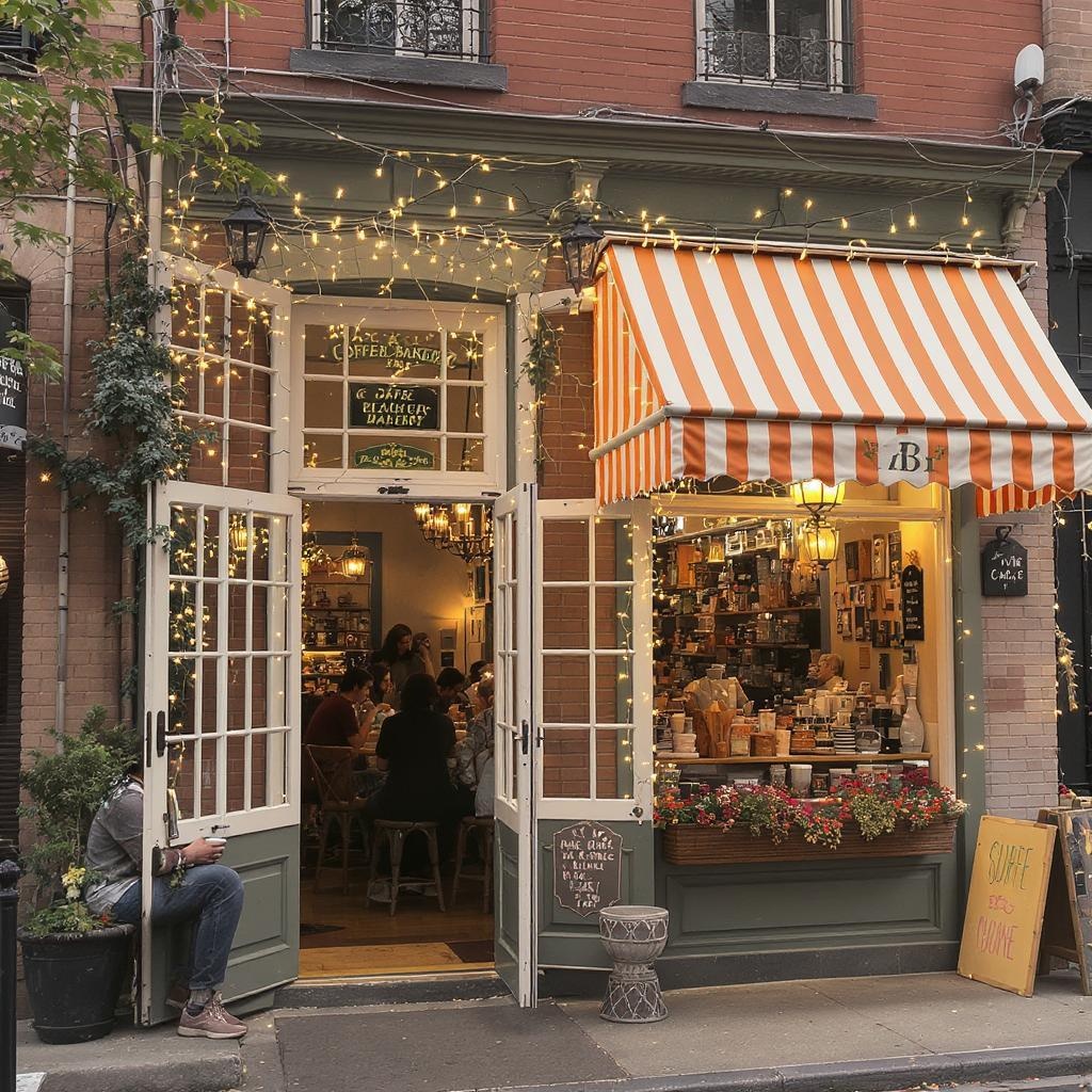 A quaint, ground-level coffee-bakery shop in New York features charming white window frames that open upward, folding towards the ceiling. To the left of the central front door, a group of patrons sits on rustic wooden stools, savoring their coffee and engaging in lively conversation. On the right side, a festive awning with vertical orange and white stripes adds a pop of color above the right window, offering shade to those gazing at the bustling street. The exterior is adorned in earthy tones, with warm browns and subtle greens blending harmoniously into the urban setting. Shimmering fairy lights twinkle above, casting a cozy glow as they loop around window frames and the awning, drawing in passersby with a welcoming ambiance.
