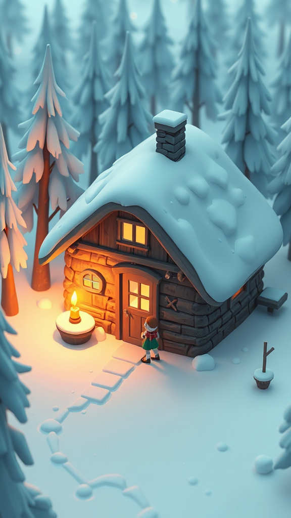 A quaint, rounded cabin nestled in a snowy forest, crafted in a low poly isometric style. The scene draws inspiration from Andreas Rocha, with stylized character design and soft image shading. The palette features rich, deep colors, and the high-resolution lighting enhances the cozy atmosphere. A charming character stands in front of the cabin, illuminated by the warm glow of a candlelight emanating from within. The frontal view reveals intricate details of the cabin's architecture, with its rounded roof and inviting facade. The entire scene exudes a sense of warmth and serenity amidst the wintery landscape, with subtle creative touches that add a touch of whimsy to the composition.
