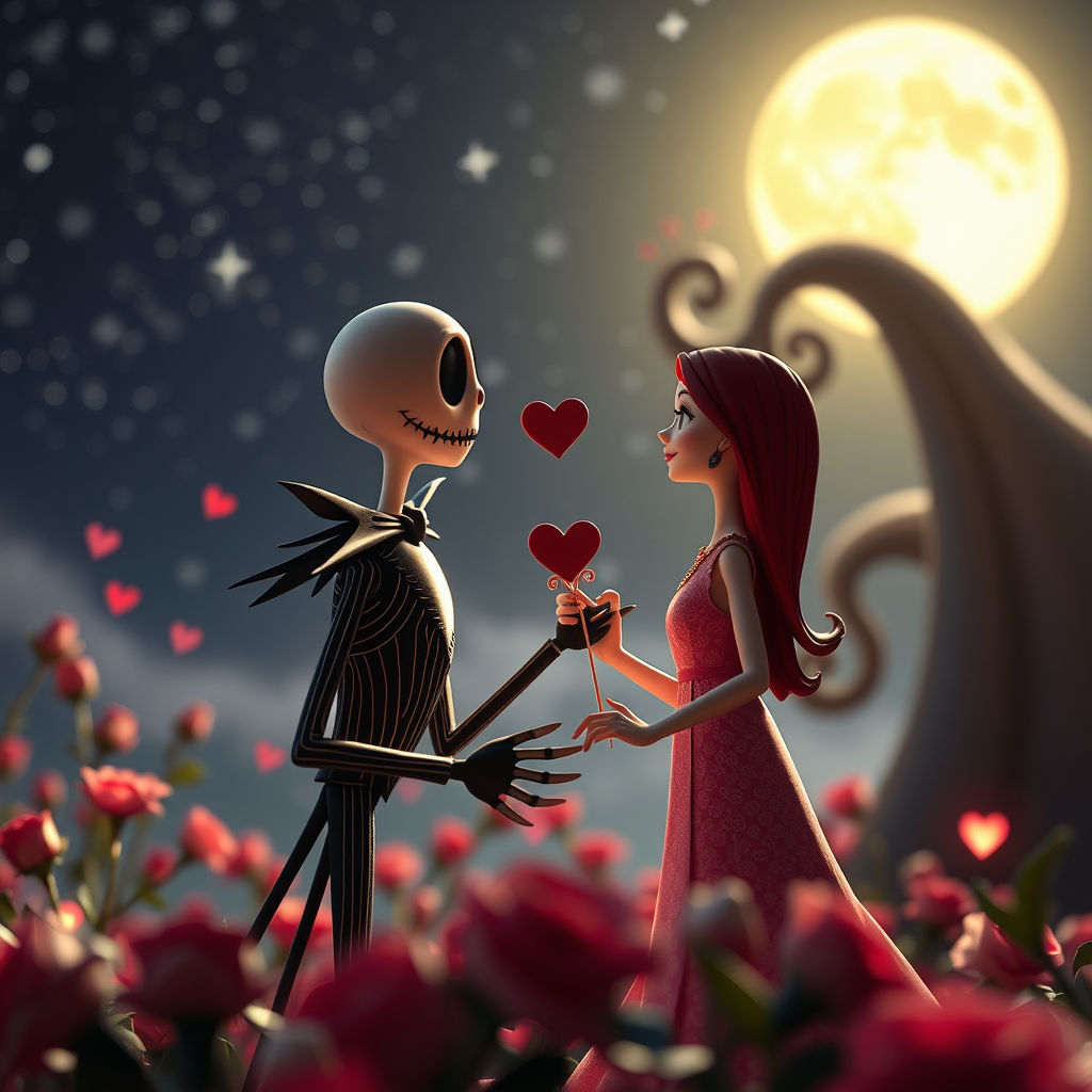 A quirky and hauntingly romantic scene unfolds in a stop-motion animated style, where Jack Skellington and Sally express their love amidst a whirlwind Valentine's festival. The setting is an enchanting night under a vast, star-studded sky, with a luminous moon casting an ethereal glow on a landscape dotted with roses and hearts. The atmosphere is imbued with Tim Burton's signature gothic touch, blending whimsy and darkness in perfect harmony. Their tender affection is highlighted by a dynamic depth of field, bringing a cinematic composition that captures both the eerie and charming essence of their unique romance.