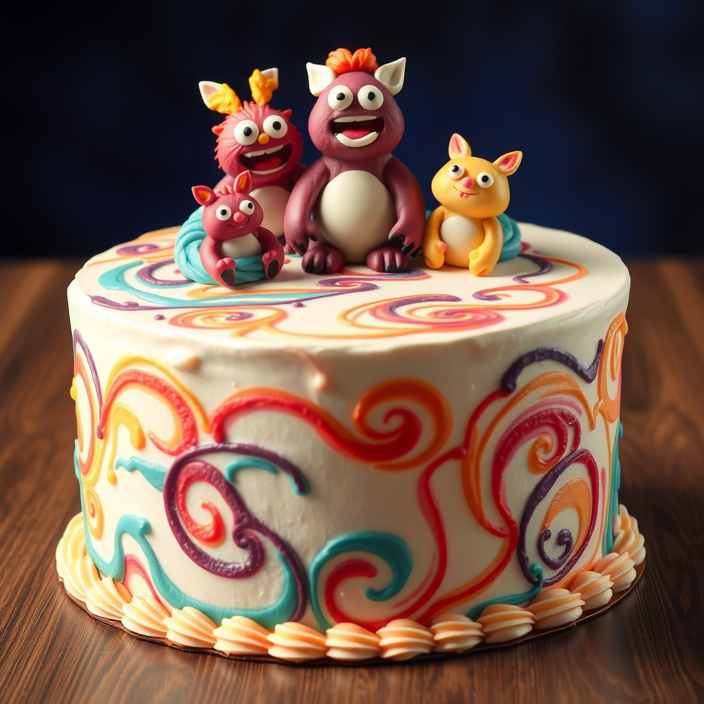A quirky confection, inspired by the mischievous chaos of a certain cult film, transforms a simple cake into a whimsical scene of delightful mayhem; decorated with vibrant, swirling icing reminiscent of midnight hues, and topped with edible critter characters whose expressive features and playful expressions add a touch of humor and nostalgia, this cake strikes the perfect balance between charm and a sprinkle of cinematic mischief.