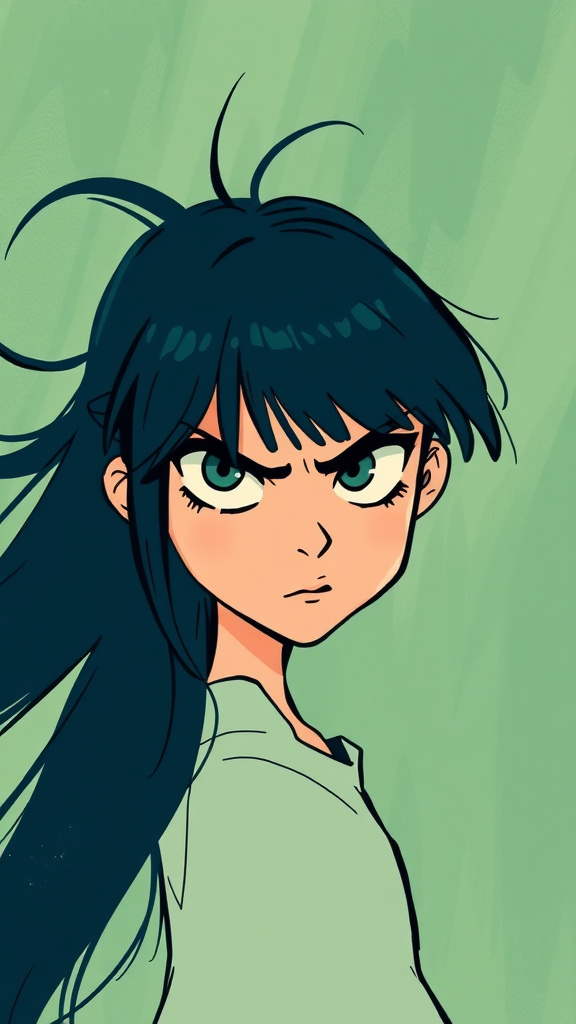 A quirky manga-inspired scene featuring a girl with flowing long hair and broad shoulders, her eyes fierce and intense, captures the viewer's attention. The artwork is reminiscent of Bill Watterson and Craig Davison, with an animated, dynamic flair. The color palette blends dark indigo and light green, evoking a sense of depth and moodiness. Emotionally charged brushstrokes hint at the influence of Rumiko Takahashi, bringing the piece to life with vivid energy and emotion.