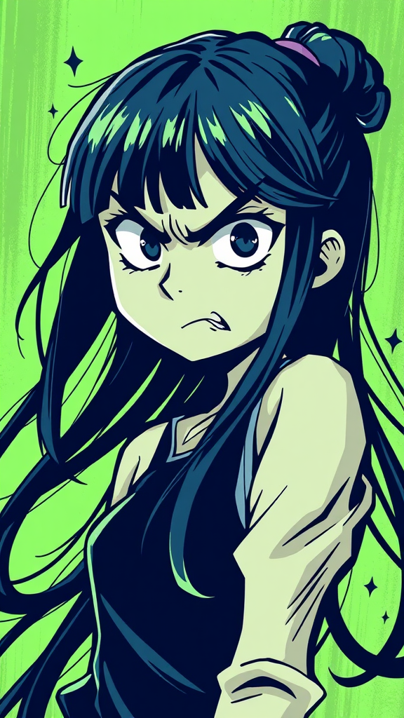 A quirky manga-style illustration featuring a girl with flowing long hair and prominent shoulders, her eyes seething with anger. The artwork blends the playful essence of Bill Watterson and the dynamic animation feel of animated gifs, echoing the vivid storytelling of Craig Davison. Using a color palette of deep indigo and vibrant light green, the scene captures the emotional intensity through expressive, energetic brushstrokes, reminiscent of Rumiko Takahashi's signature style.