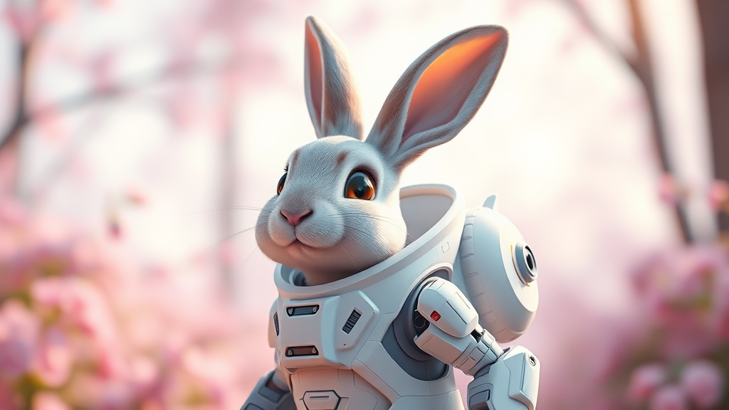 A rabbit adorned in a futuristic exosuit, designed with Pixar-style charm, in soft pastel hues, featuring intricate natural and realistic lighting and shading. Experience high-quality, ultra-detailed visuals as the scene is brought to life with a 3D render using Cinema 4D and Octane Render, utilizing advanced ray tracing techniques in stunning 8K resolution—a whimsical yet sophisticated blend of nature and technology.