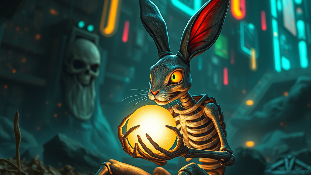 A rabbit holds a glowing orb amidst a cyberpunk setting, inspired by the style of Tomasz Alen Kopera and Beeple. The scene blends fantasy and technology with a skeleton warrior theme, featuring a textured, detailed skeleton. Influences from "The Demon Seated" and shaman witch elements are evident, creating an official fanart look suitable for Behance in high definition. The artwork bursts with vivid colors, rendered in 16k UHD HDR10, displaying the surreal essence of a techno-shaman character. The rabbit's eyes are bright and expressive, surrounded by intricate details in a harmonious composition. The environment is a symphony of neon lights and futuristic elements, echoing the ghostly aura of Anubis, set against a backdrop that evokes an otherworldly, yet heartwarming, atmosphere. The digital painting features sharp clarity, avoiding any blurriness or artifacts, while carefully crafted to invite viewers into this unique and imaginative realm.