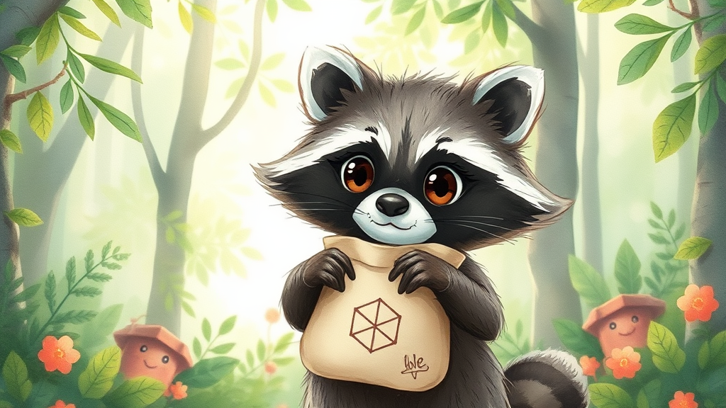 A raccoon with large, expressive eyes and a playful demeanor stands in a lush, whimsical forest. Its fur is depicted with delicate, handmade lines reminiscent of Studio Ghibli's enchanting style, and soft watercolor effects bring the scene to life with gentle pastel hues. The raccoon adorably clutches a cloth bag, the fabric appearing textured and tactile. On the bag, a subtle cube symbol is intricately drawn, adding a touch of mystery to the otherwise endearing and kawaii-inspired illustration. The forest backdrop is filled with dappled light filtering through the leaves, enhancing the magical and serene atmosphere.