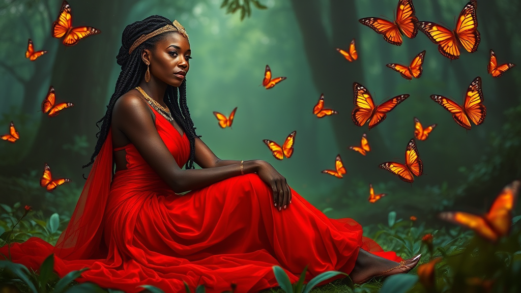 A radiant African queen with dark, glistening skin, sits gracefully on an emerald forest floor, her fiery red dress cascading around her like liquid passion. Iridescent butterflies dance warmly around her, their wings sparkling with shades of gold and crimson as they pay homage to the ethereal goddess. Her striking visage, both regal and tender, carries the mystique of a modern-day Cleopatra. Exuding an ethereal aura drawn from afrofuturism and inspired by the delicate yet powerful artistry of masters like Thomas Blackshear, RossDraws, and Rob Rey, she embodies an ancient, timeless magic. Her presence resonates with the essence of the Butterfly Goddess of Fire, casting an enchanting aura under a starlit canopy, as if the celestial tapestry itself was woven in celebration of her strength and beauty.