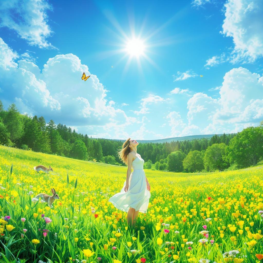 A radiant and bright spring landscape unfolds as you stand on a blossoming meadow, with a dense forest at your back. The sun shines brilliantly, and the sky is a vivid blue adorned with a few scattered fluffy clouds. The atmosphere is infused with a sense of boundless freedom and optimism. A butterfly flutters by, while a field hare hops merrily across the grass. Your gaze is lifted towards the sky, with a sense of wonder and a smile in your eyes. Breathing deeply, you are ready to embrace the day and tackle all its challenges with joy and confidence.