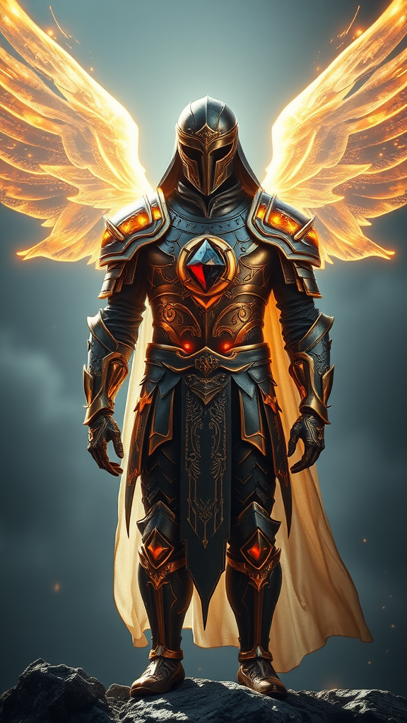 A radiant armor of divine light encases the warrior, shimmering with hues of gold as they stand on the precipice between realms of good and evil. Dark as midnight, a black diamond glistens upon their chest, symbolizing the eternal struggle within their soul, a battle of purity and shadow.