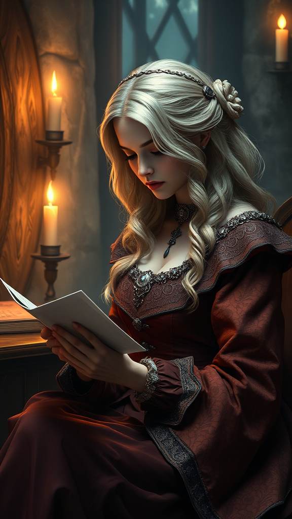 A radiant blond woman in a richly detailed medieval gown diligently writes a letter by the warm glow of candlelight, her surroundings steeped in a mystical ambiance. The scene captures the essence of fantasy art, reminiscent of Wojtek Fus’s ethereal style and the captivating presence of Ciri from "The Witcher." Her features, rendered in exquisite 4K detail, are inspired by Magali Villeneuve’s graphic artistry. This atmospheric composition is a blend of the best fanart seen on ArtStation, embodying an epic fantasy portrait. The enchanting visuals align with the fantasy game art genre, creating stunning character art that transports viewers to a magical realm.