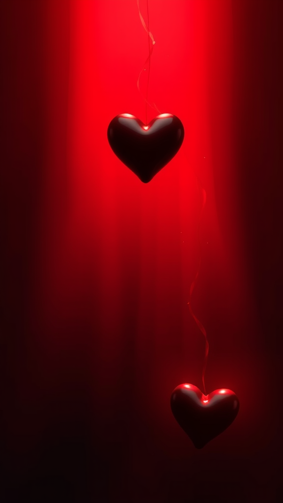 A radiant cascade of light melds and flows like molten liquid across a deep red-black gradient backdrop, casting an ethereal glow. In the top left corner, a sleek black heart contrasts strikingly against the vibrant gradient, while a similar heart anchors the bottom right, creating a sense of symmetry and balance. The dynamic lighting adds depth and movement, enhancing the photorealistic fantasy concept. The scene evokes a sense of cinematic wonder, featuring breathtaking visuals and intricate detail that captivates the viewer's imagination, akin to the mesmerizing allure popular in contemporary art circles.