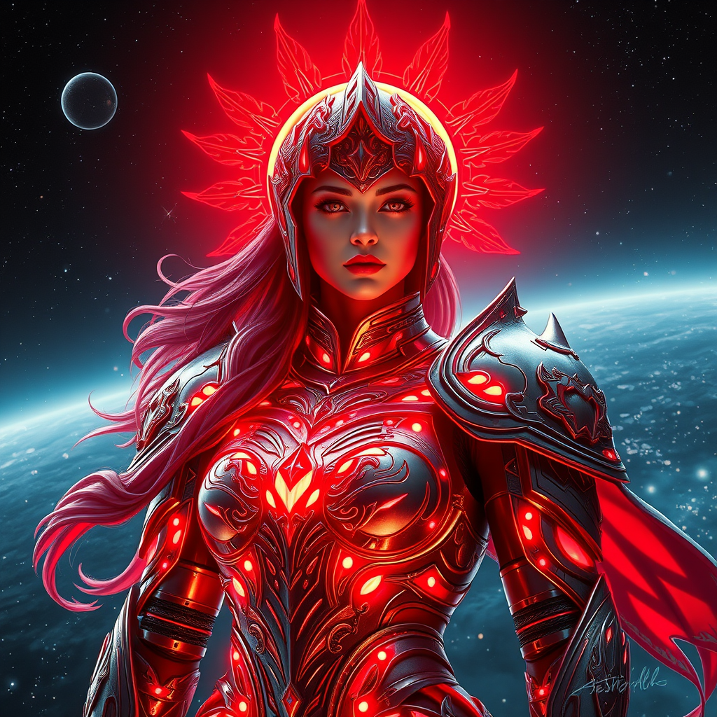A radiant celestial warrior emerges in the vastness of space, adorned in beautifully intricate, futuristic armor that glows with a divine, decadent red hue. Her armor is both elegant and battle-worn, reflecting countless encounters across the stars. This ultra-realistic depiction captures her as a goddess-like figure, combining elements of sci-fi and realism in a cinematic manner. Her presence is both intricate and hyperrealistic, capturing the essence of a celestial knight. Despite the grandeur, imperfections subtly mark her form, hinting at the organic flaws of anatomy - a few extra digits, slightly misshaped features, and signs of wear. The image bears the marks of jpeg artifacts, a signature half-visible, edges cropped to focus on her ethereal yet fiercely graceful figure, a testament to her divine resilience amidst the cosmic theater.