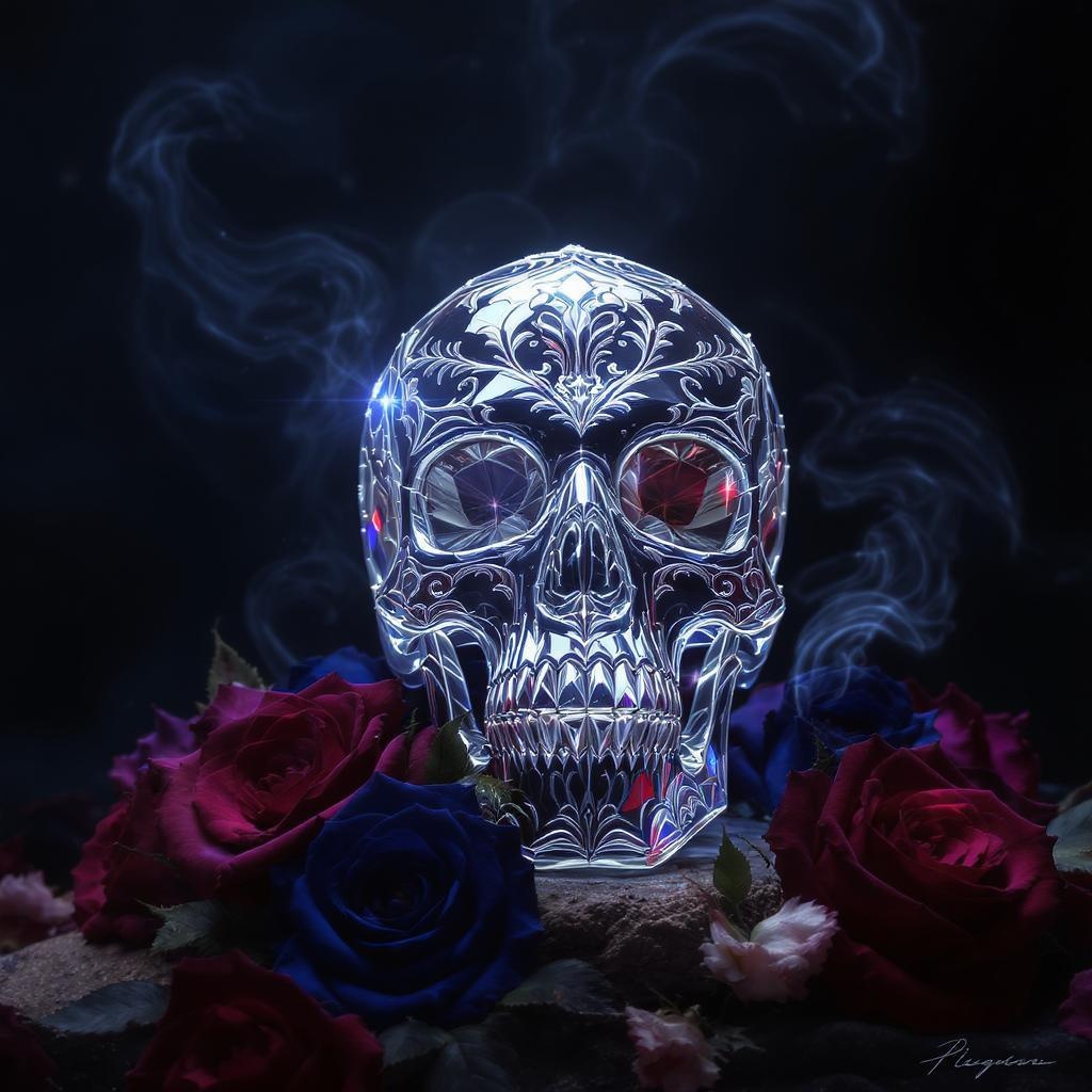 A radiant crystal skull adorned with intricate carvings, encircled by an enchanting array of velvety roses in hues of deep crimson and midnight blue. Set in a mystical dark fantasy realm, the scene is imbued with ethereal magic, captured in an epic shot with dramatic and cinematic lighting. The atmosphere is both haunting and captivating, evoking an otherworldly allure. Rendered in extreme detail, every facet of the crystal reflects hints of shimmering light, amplifying its ornate beauty. Channeling the style of Brian Froud, the composition is a masterpiece of fantasy art, presented in ultra-high definition with vivid HDR and 8k resolution, drawing the viewer into its mesmerizing depths.