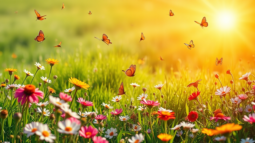 A radiant embodiment of springtime, full of life and renewal, where flowers bloom vibrantly and gentle breezes whisper through lush, green meadows. The sun casts a warm, golden glow that dances playfully across the landscape, capturing the essence of rebirth. Delicate butterflies flit among the blossoms, while birds sing joyful melodies, painting a serene and harmonious picture of nature's awakening. The colors are vivid and rich, evoking a sense of joy and the promise of new beginnings.