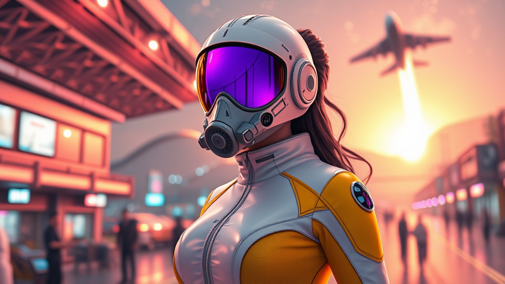 A radiant female figure stands confidently in a sleek, form-fitting white and yellow detailed jumpsuit, set against the bustling backdrop of a spaceport. A majestic spaceship takes off in the distance, creating a dramatic, cinematic scene. Her face is partially obscured by a futuristic mask adorned with a purple sci-fi visor, accompanied by an advanced sci-fi respirator tinged with vibrant shades. The setting is a stunning symphony of colors and intricate details, evoking a surreal yet divine cosmic atmosphere reminiscent of a celestial masterpiece. The imagery boasts hyperrealistic qualities, with smooth, shiny surfaces and cinematic lighting that imbues the scene with a dreamlike, anime-inspired touch. Utilizing the refinements of Unreal Engine 5, the environment brims with surreal reflections and 3D elements, achieving an exquisite luminescence. Despite the unreal ambiance, the focus remains sharp, capturing a scene that's both intricate and polished. The entire composition conveys an awe-inspiring sense of otherworldly beauty and imaginative artistry.