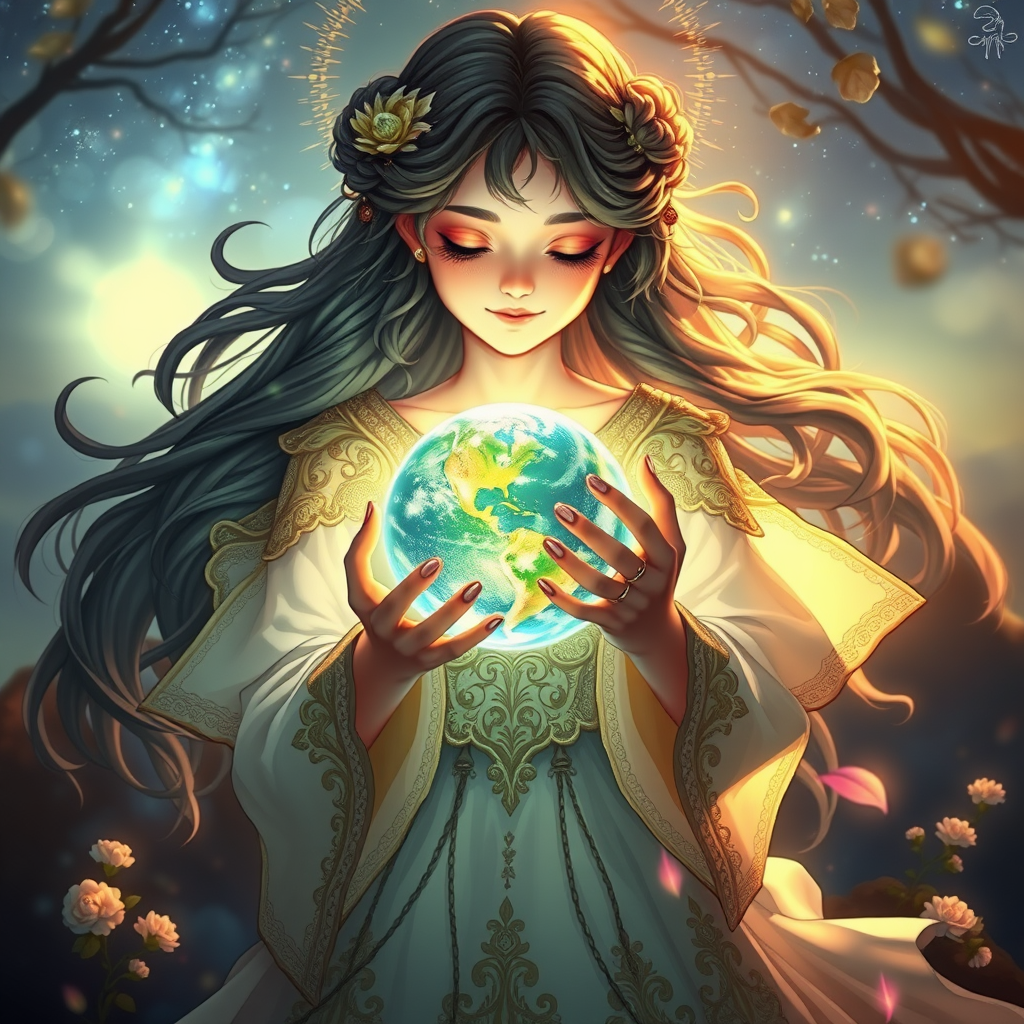 A radiant girl in an ornate flowing dress cradles a glowing celestial orb in her hands, embodying the spirit of an earth goddess from mythic lore. The scene evokes the mystique of fantasy art with a touch of realism, capturing her ethereal beauty and divine connection to nature. The illustration, reminiscent of the detailed and emotive styles of Artgerm and Atey Ghailan, weaves in elements of anime flair alongside the atmospheric depth characteristic of Guweiz, resulting in a striking digital artwork. Her serene expression and the intricate details of the dress shimmer within a mystical landscape, a testament to the mesmerizing allure of fantasy and the enchanting beauty of the world she holds.