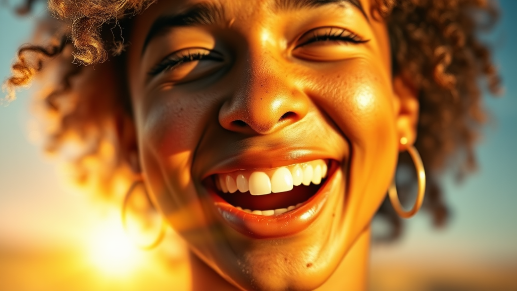 A radiant portrait capturing the warmth of sunshine on the skin and joyful laughter echoing in the air, evoking a sense of life's goodness. The image is filled with stunning gradient colors and a remarkably detailed background. Despite a slightly dirty face and earrings adding character, the focus remains sharp with HDR-level clarity. The scene avoids distractions like watermarks, text, or blur, ensuring a pristine visual experience. It features a close-up angle that highlights the facial features, including the nose, while maintaining a natural and captivating composition. The result is a vibrant and intimate representation, offering a glimpse into a moment of pure happiness, with a hint of playfulness and spontaneity.