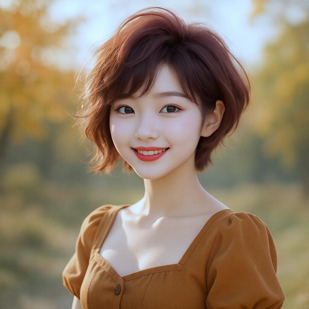 A radiant portrait of a young, stunning girl with an enchanting smile is captured, showcasing her stylish asymmetrical haircut. She dons a chic autumn dress, perfectly complementing the serene outdoor backdrop. This image, celebrated for its minimalist essence, gained acclaim by winning a prestigious contest and being highlighted on CG Society.