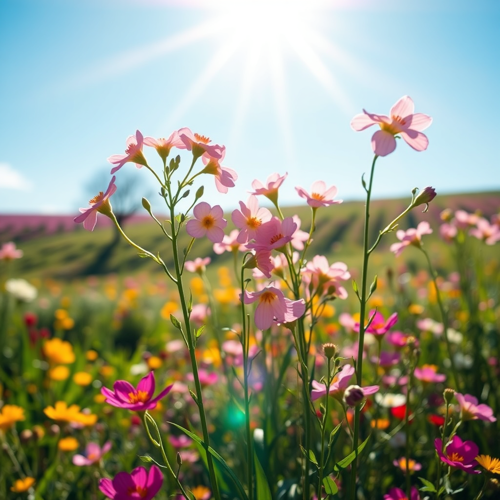 A radiant scene of springtime joy, with blooming flowers swaying gently in the breeze, vibrant colors adorning the landscape under a clear blue sky, all captured in a harmonious 2:1 aspect ratio, invoking a serene yet exuberant sense of renewal and bliss.