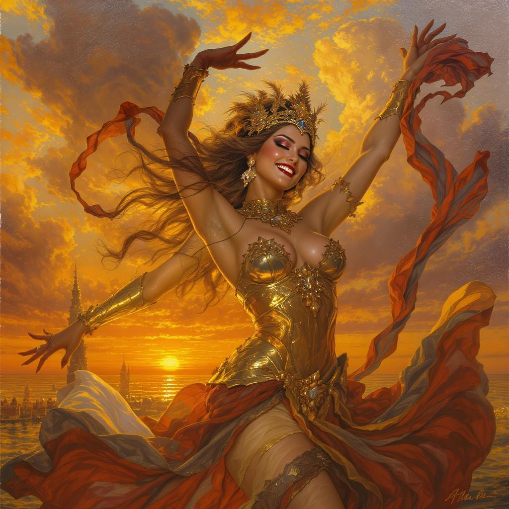 A radiant sunset casts vibrant volumetric lighting across the scene, illuminating a joyful, smiling woman in full carnival attire. Her expressive eyes gleam with the spirit of a Venetian carnival, her dance fluid yet powerful, reminiscent of a skilled bellydancer entwined with the fierce grace of a warrior. Her elegant form is captured in hyper-realistic detail, as if painted by Frank Frazetta, with lush, swirling fabrics and intricate armor glistening in warm golden hues. The sky above, adorned with clouds rendered in the majestic style of Albert Bierstadt, adds a dramatic backdrop, enhancing the painting's rich oil textures and high resolution realism. Every element, from the gentle curve of her smile to the dynamic movement of her pose, tells a story of strength and beauty, all carefully set within a stunning 16:9 aspect ratio composition.