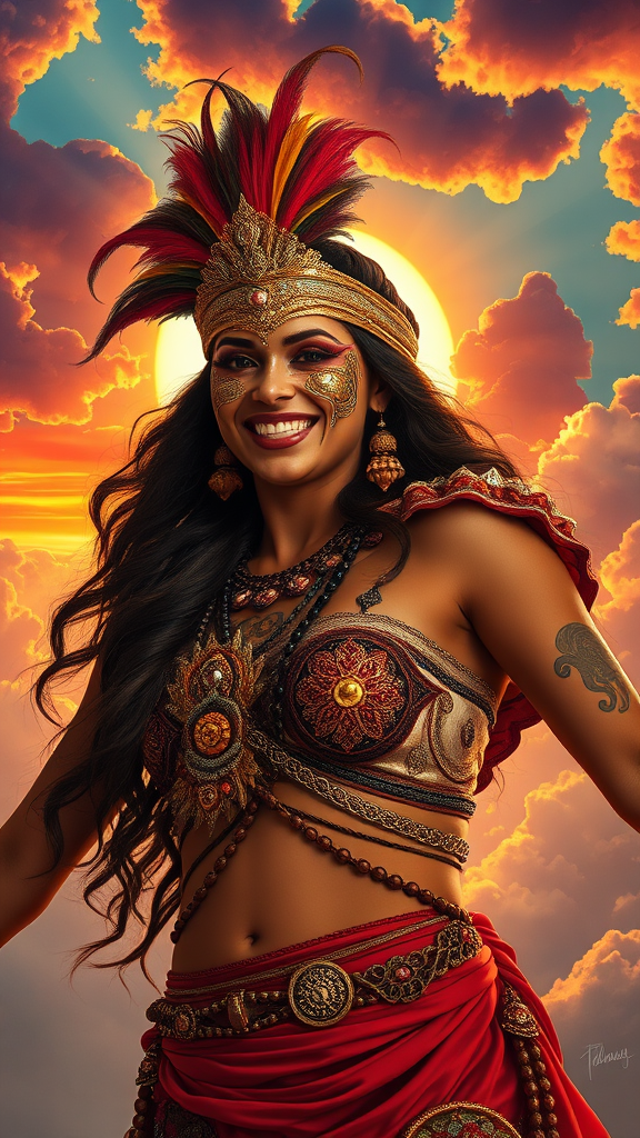 A radiant sunset casts volumetric lighting across the scene, illuminating a full-body portrait of a joyful, smiling woman exuding charm and elegance. Her attire is a mesmerizing blend of a Venetian carnival mask and intricate bellydancer garments, intertwined with warrior elements. The colors are vivid and expressive, reminiscent of an oil painting by Frank Frazetta. Around her, the sky is adorned with clouds painted with the dramatic flair of Albert Bierstadt, adding depth and atmosphere to this high-resolution, hyper-realistic depiction. The overall composition captures a harmonious balance between strength and grace.
