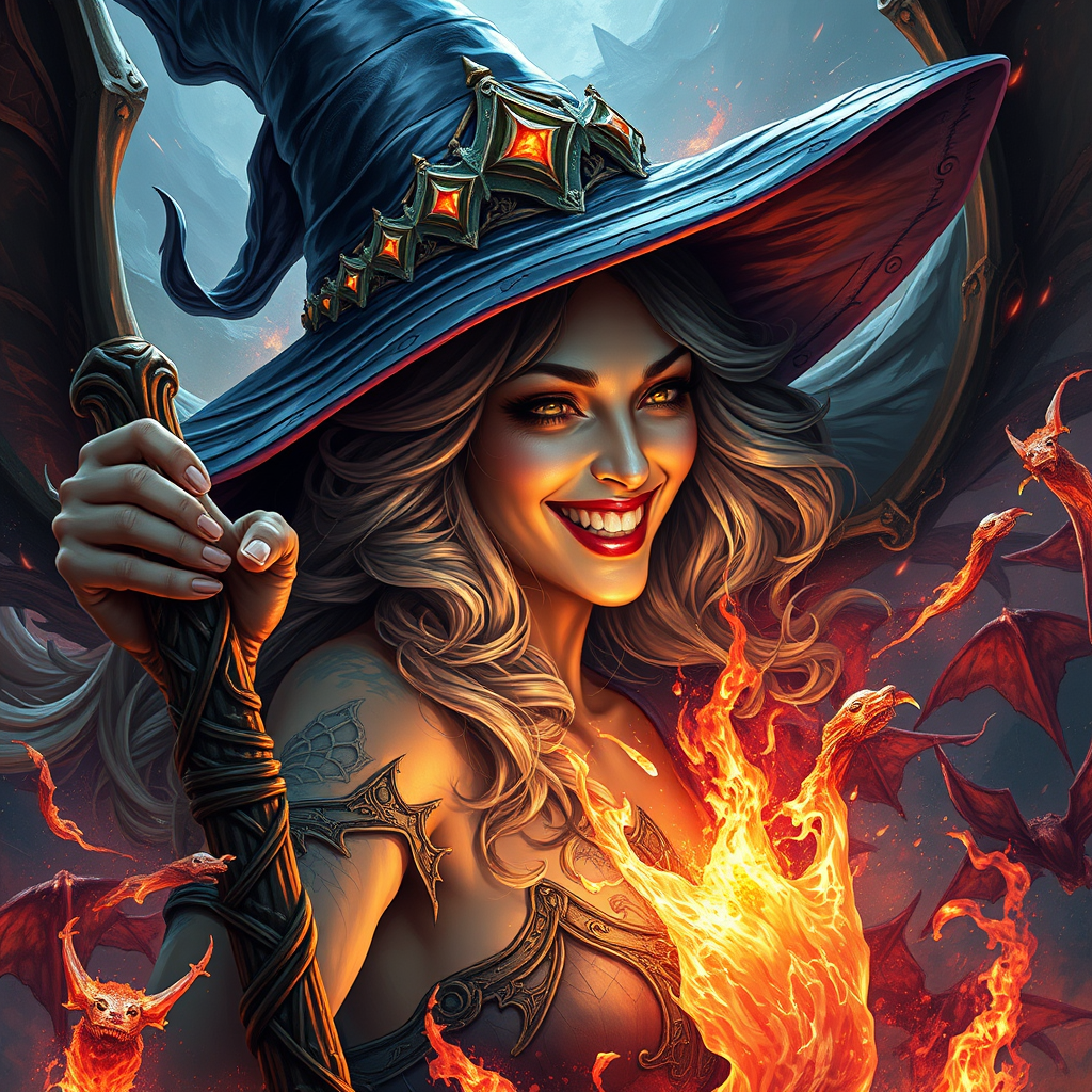 A radiant witch with an enchanting smile, engulfed in a breathtaking action scene of retribution, eledrae by taijen 3, painted in the unmistakable style of Alberto Vargas, featuring refined metamorphosis, exquisite trompe l'œil illusion detail, with bold stripcore influences, immersed in a surreal dreamscape, capturing an otherworldly essence with mystical realism. This artwork stands out as unique and ultra-detailed, abstract yet representational, crafted in Adobe Photoshop, exuding an inspired, artistic brilliance worthy of accolades.
