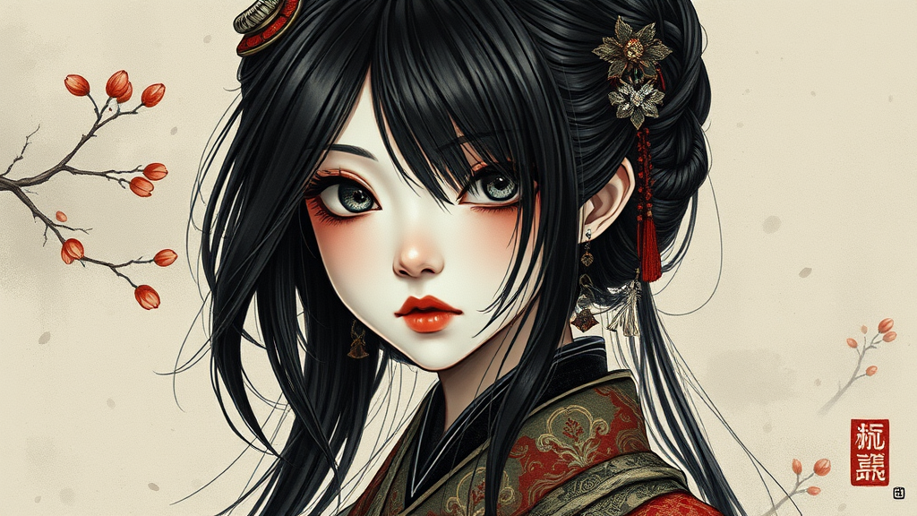 A raven-haired girl adorned in an Asian-inspired ensemble, depicted in the style of delicate ink artistry, blending elements of appropriation art and gothcore. Her expression is captured through ZBrush, creating a caricature-like yet hauntingly beautiful portraiture with layers of hidden meaning. The painted illustration combines traditional techniques with a modern edge, showcasing intricate patterns and textures. The atmosphere exudes a mysterious allure, as if she belongs to a world where past and future intertwine.
