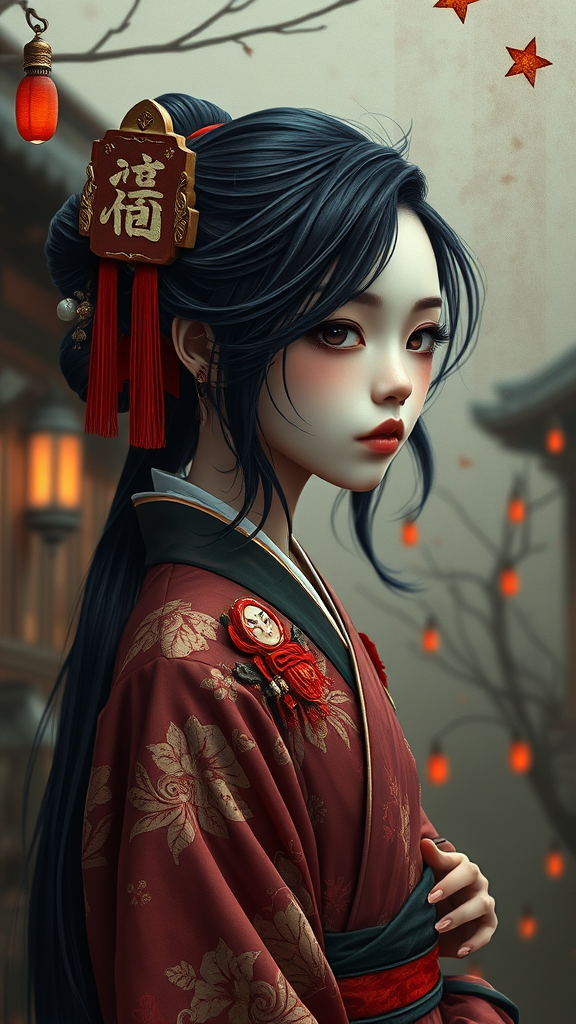 A raven-haired girl adorned in an Asian-inspired ensemble, captured in a style reminiscent of delicate ink application combined with the essence of appropriation art, infused with gothcore elements. Her presence is sculpted with a nod to ZBrush, transforming her into a captivating character caricature. The portrait is layered with enigmatic meanings, evoking the mystery of painted illustrations. The scene unfolds in a 6:7 aspect ratio, where each detail whispers a story, drawing inspiration from a fusion of artistic styles that blend seamlessly.