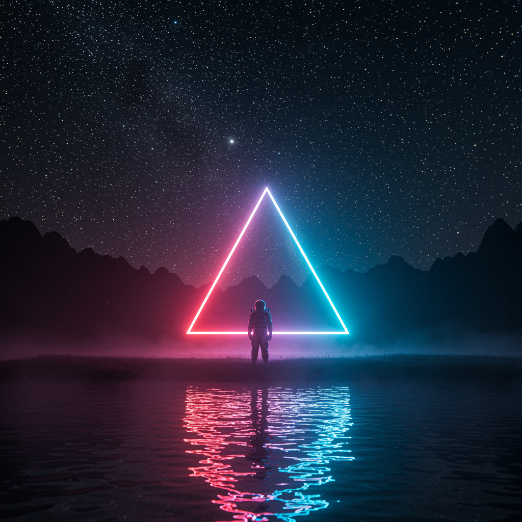 A raw, highly detailed photograph captures a mesmerizing scene. An astronaut, clad in a futuristic suit, stands solemnly on the edge of a misty lake under the starry night sky. The serene waters mirror the celestial spectacle above. A massive, glowing neon triangle hovers nearby, casting vibrant hues across the landscape and reflecting vividly in the rippling water. An ethereal blend of 8K UHD and HDR immerses the viewer in the scene, where the astronaut and geometric form create a captivating, otherworldly tableau.