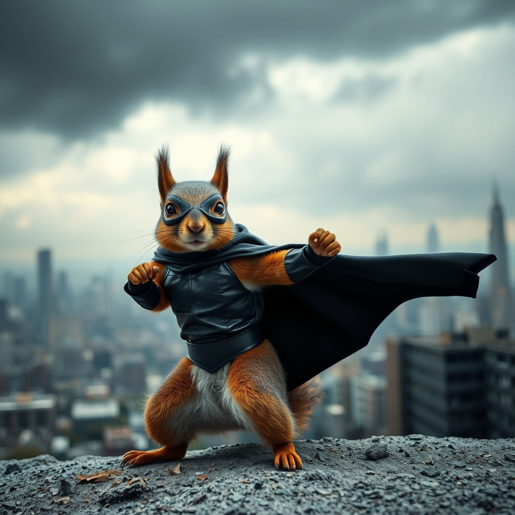 A raw photo capturing a squirrel depicted as a superhero, dressed in a sleek black costume reminiscent of a legendary vigilante, striking a heroic pose amidst a desolate cityscape. The background reveals a city in ruins under a brooding, stormy sky. The scene is captured in 8k ultra-high-definition, using a DSLR camera with the precise quality of a Fujifilm XT3. The lighting is soft, enhancing the dramatic atmosphere, complemented by subtle film grain for a cinematic feel. The composition creates an intriguing fusion of whimsy and epic storytelling.