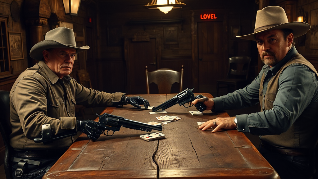 A raw photo of a futuristic cybernetic robot, sans cowboy hat, supplants a human at a worn wooden poker table in a dusty, dimly lit classic western saloon, its metal legs and hands splayed across the felt in a fusion of technology and old west. Sweat-glistened cowboy steel guns rest on the table, alongside a deck of worn cards, between a poker player with a bushy mustache and a robot so complete, down to fake leather shoes and armoire-esque "spare bullets".
